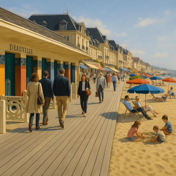 Deauville est souvent associée au glamour et à la haute société. Avec ses cabines de plage colorées et ses célèbres planches, cette station balnéaire attire les visiteurs souhaitant allier détente et culture. L’atmosphère y est chic, et vous pourrez profiter de boutiques, casinos, ainsi que d'un festival du cinéma qui s'y tient chaque année.